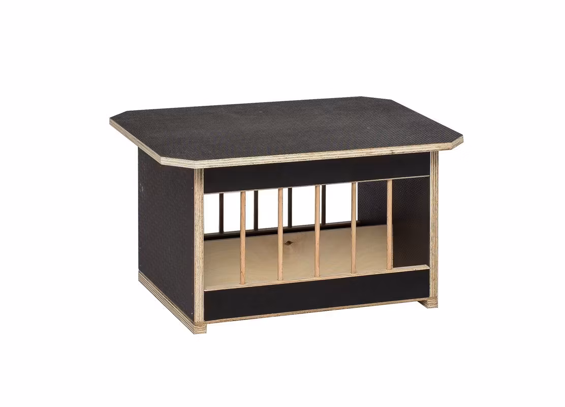 Mataren är gjord av svart vattentät plywood för mat, grus och mineraler. Tack vare den funktionella uppdelningen är det möjligt att servera två typer av mat samtidigt. Den stora ytan på locket fungerar som ett stativ för vatten automater, håller vattnet rent, och den grova finishen hindrar den från att röra sig.
