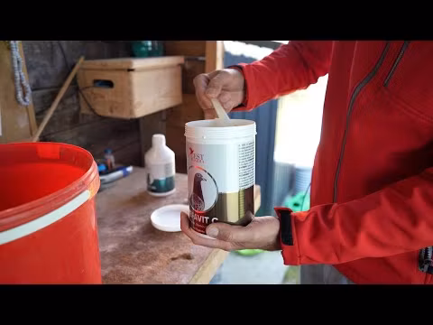 1 sked per 1 kg foder, fuktat med vitlöksolja. Under tävlingssäsongen ges vid ankomstdagen samt dagen efter. Under avels-, rugg- och viloperioden ges 1–2 gånger per vecka.